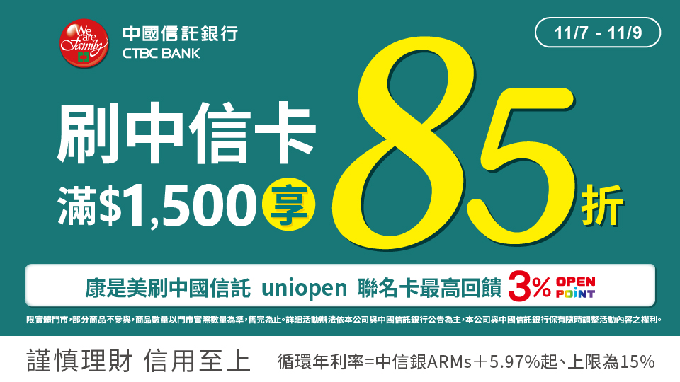 1.活動期間於實體門市購買指定商品,刷中信卡單筆結帳金額滿$1,500享85折(扣除不適用商品、折扣金額、會員點數折現及信用卡紅利點數折抵),須整筆全額刷中信卡支付。