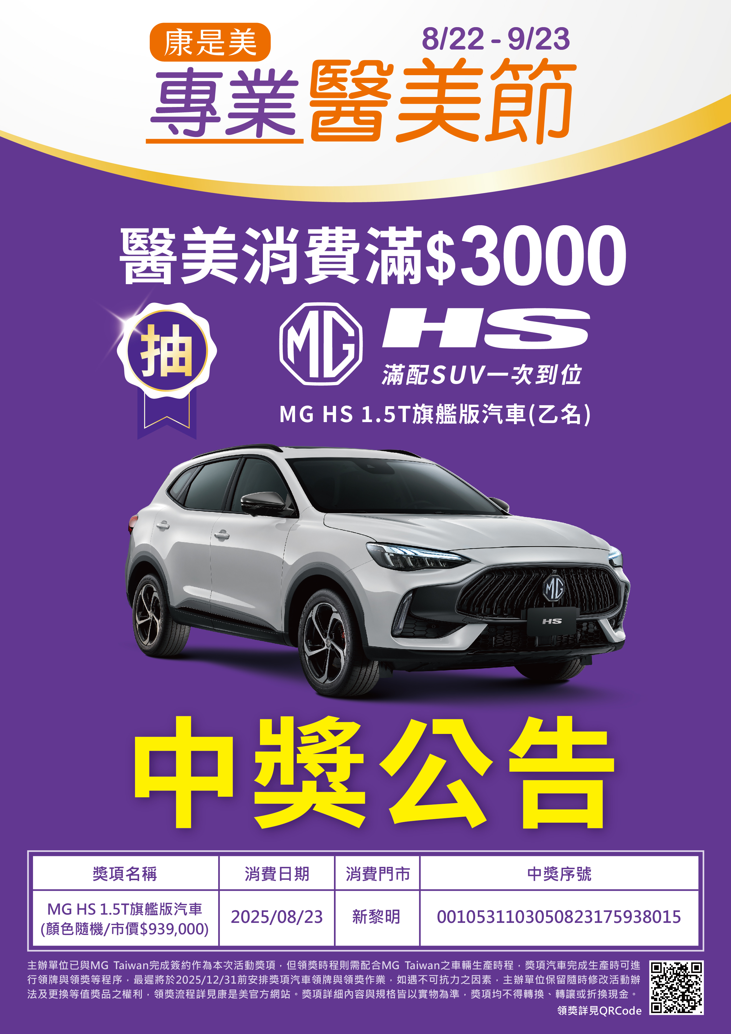 【中獎公告】專業醫美節滿額抽MG HS 1.5T旗艦版汽車