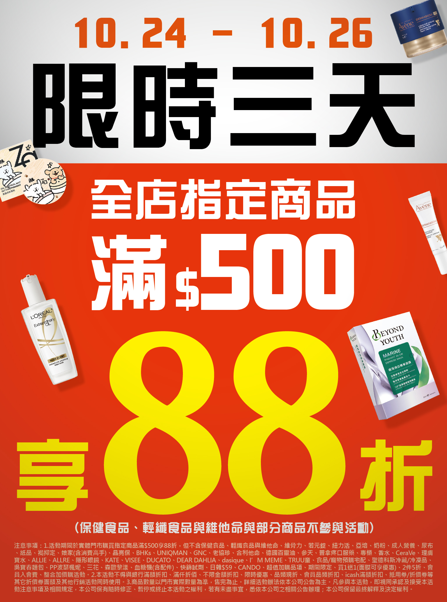 10/24-10/26 限時三天全店指定商品滿$500享88折活動說明與注意事項