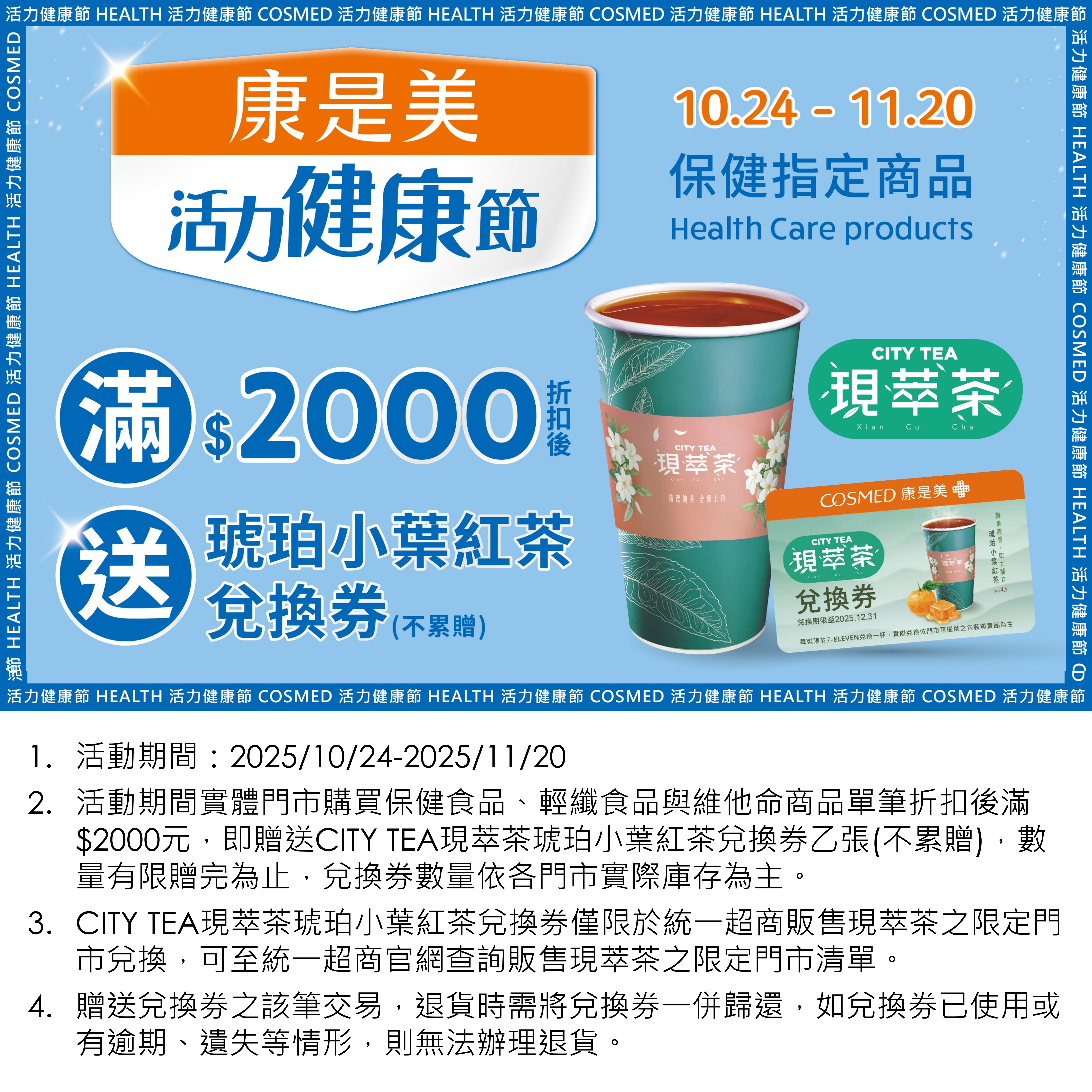 10/24-11/20 活力健康節滿額送現萃茶兌換券活動注意事項與限制條件