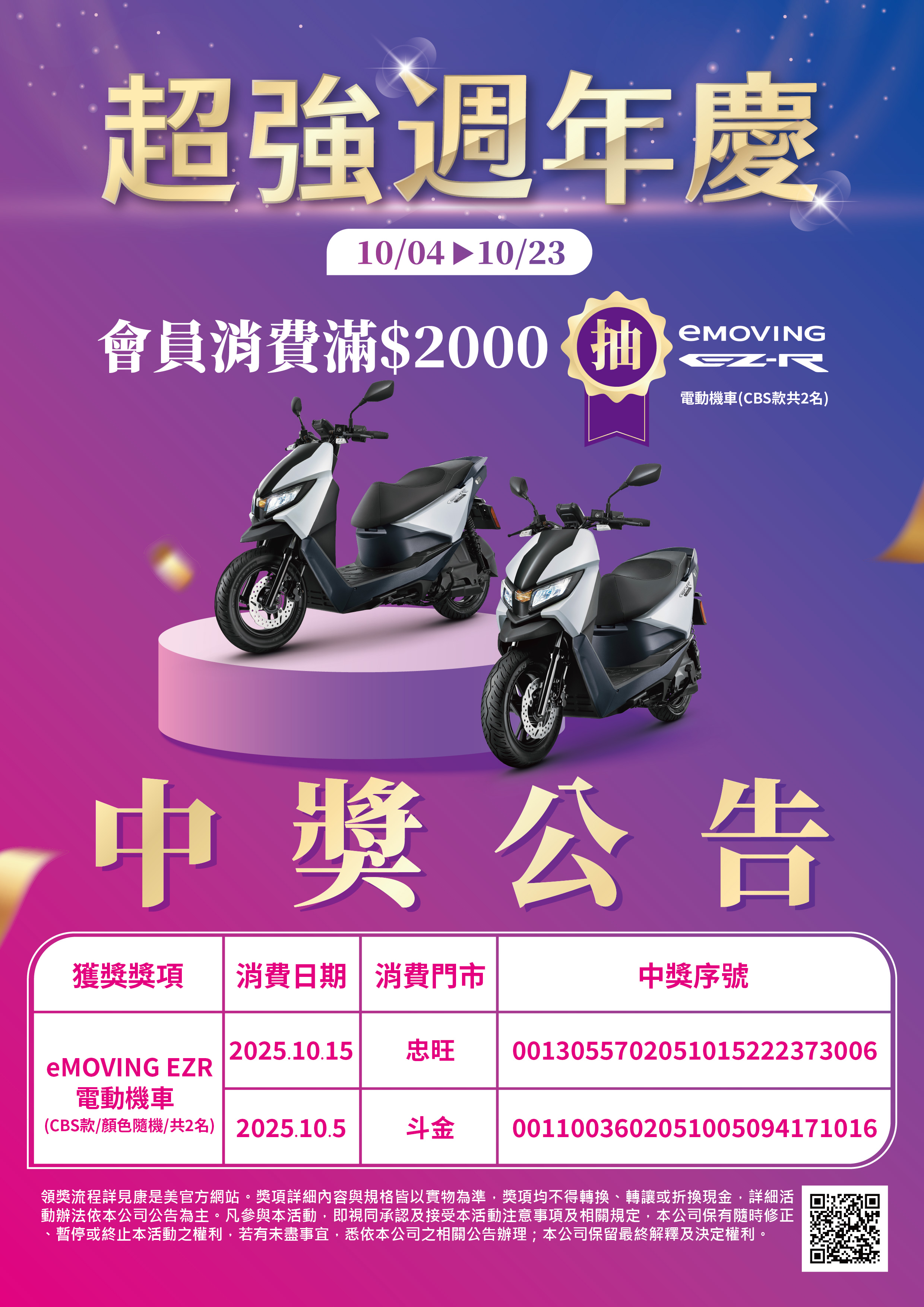 【中獎公告】 超強週年慶滿額抽eMOVING EZ-R CBS款電動機車