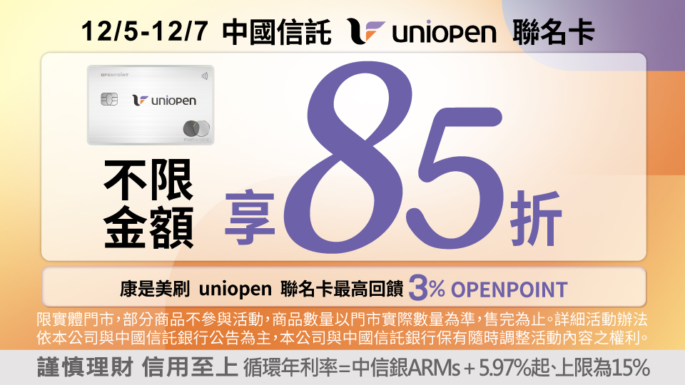 5. 康是美刷中國信託 uniopen 聯名卡最高回饋3%OPENPOINT(一般消費1%回饋無上限;統一企業集團加碼2%,每月回饋上限500點),依中國信託銀行官網公告為主。