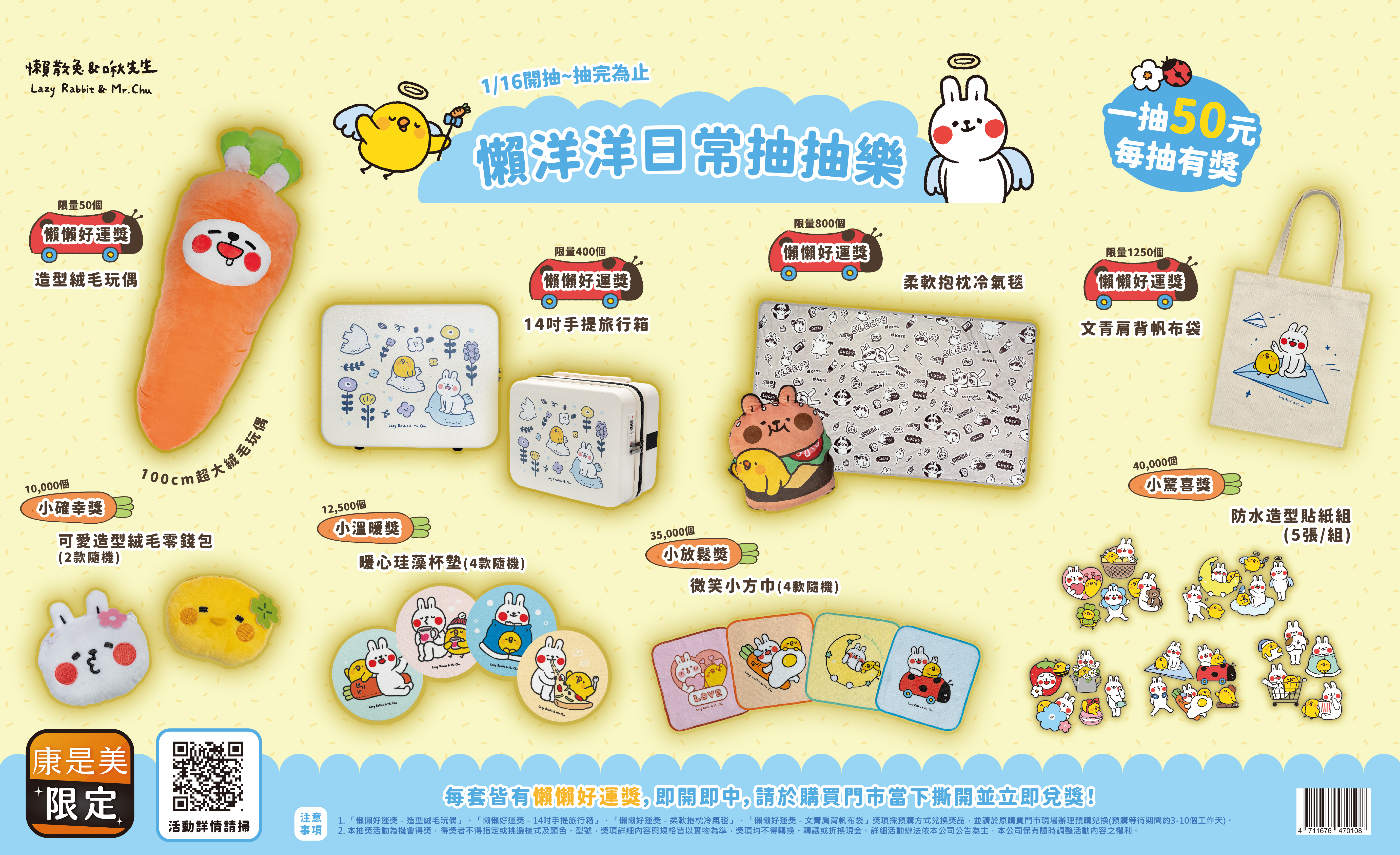 實際中獎情形依抽獎券券面顯示為準;全活動獎項係依隨機方式配置至各門市與套組中,各門市實際販售套組內之獎項數量、種類與分布,將依隨機配置為準,並非每套皆包含所有懶懶好運獎獎項。
