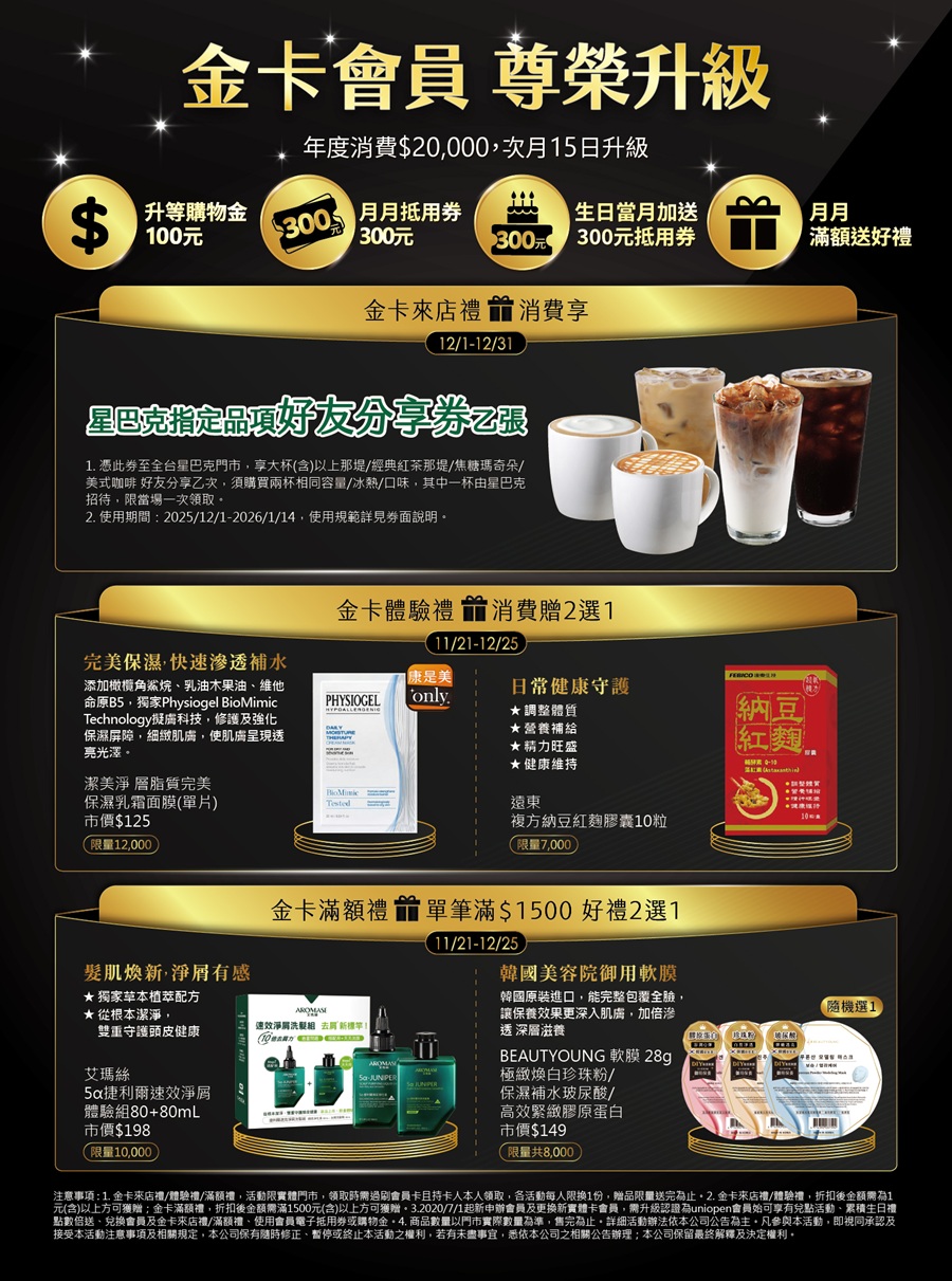 3.2020/7/1起新申辦會員及更換新實體卡會員,需升級認證為uniopen會員始可享有兌點活動、累積生日禮點數倍送、兌換會員及金卡來店禮/滿額禮、使用會員電子抵用券或購物金。