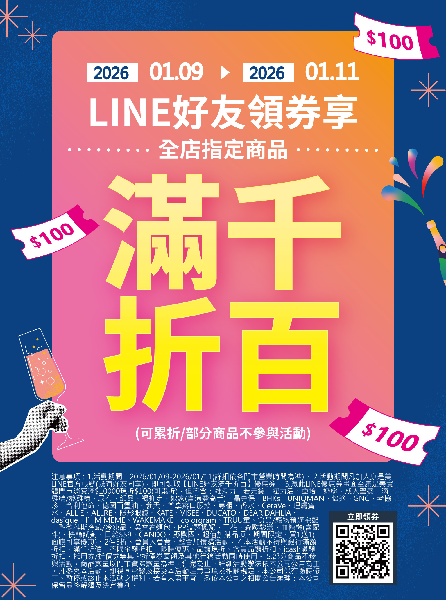 1/9-1/11 LINE好友憑券滿$1000折$100