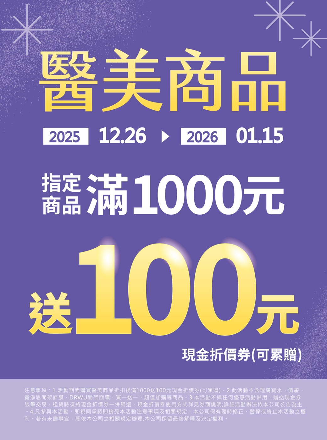 2025/12/26-2026/1/15 【醫美商品滿$1000送$100】