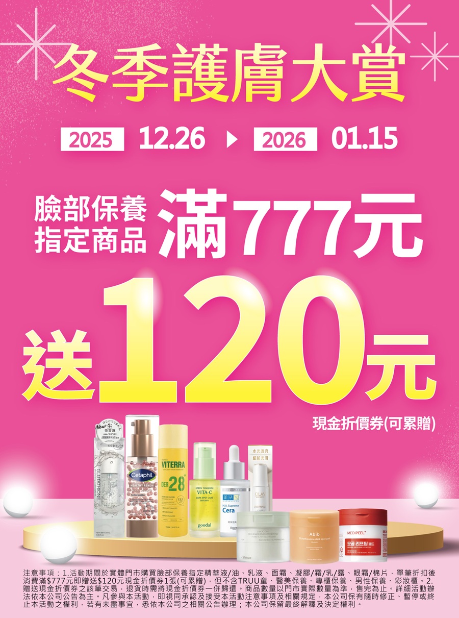 2025/12/26-2026/1/15 【臉部保養滿$777送$120】