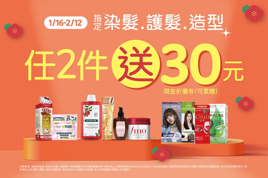 活動期間於實體門市購買染髮、護髮、造型指定商品任2件即贈送$30元現金折價券1張(可累贈)。