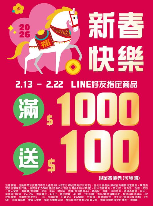 2/13-2/22 新春快樂LINE好友滿$1000送$100(累贈)