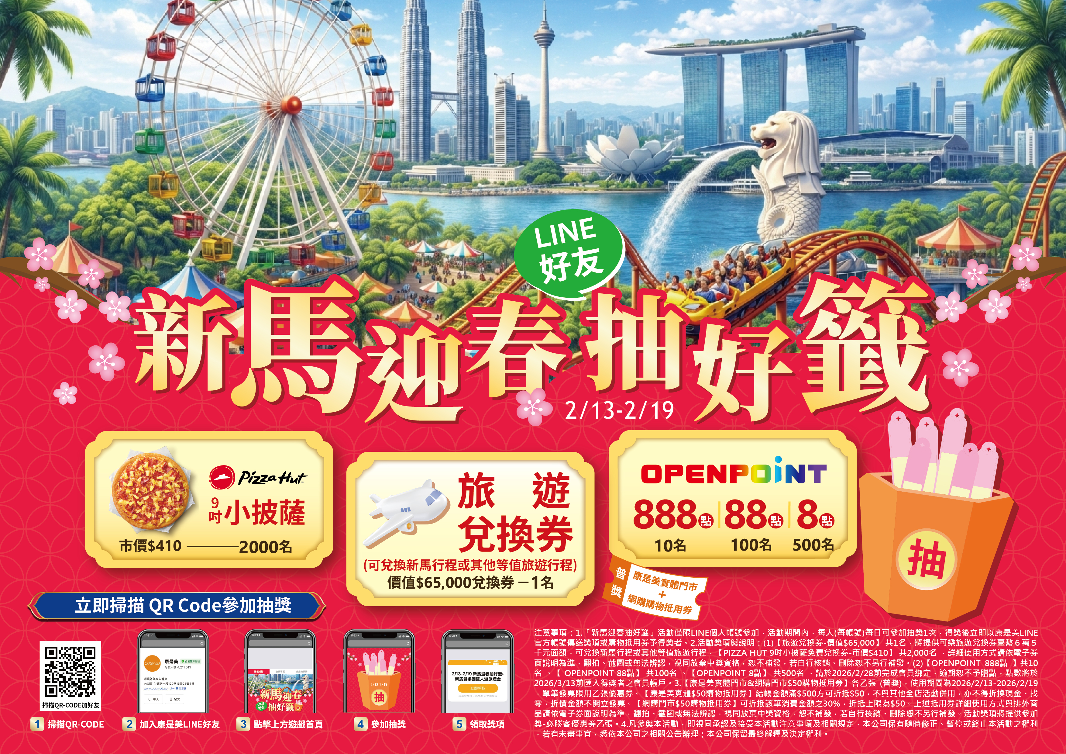 (1) 【旅遊兌換券 價值$65,000】將提供可樂旅遊兌換券臺幣6萬5千元 (兌換券面額1,000元,共65張),可兌換新馬行程或其他等值旅遊行程,兌換方式及使用效期請洽可樂旅遊全台直營銷售點;恕不接受透過其它旅行社抵用。旅遊兌換券兌換的商品以可樂旅遊網站上之所有產品皆可以使用,唯該參團之小費&辦理相關證件之個人規費(護照/簽證⋯等需請您付現)無法憑此券支付)。本獎項僅限居住於台灣、澎湖、金門、馬祖地區領有中華民國護照或合法居留證者參加。主辦單位將於2026/2/28前將以康是美LINE官方帳號訊息推播個別通知領獎方式,得獎者須於2026/3/15前將「LINE得獎憑證手機核銷後畫面」、「得獎回函」(請於官網「新馬迎春抽好籤」活動說明頁面下載)正本寄回康是美總公司(地址:台北市內湖區內湖路一段120巷15弄25號4樓 康是美會員活動小組),以郵戳為憑,逾期視同放棄得獎資格,獎項不補抽,得獎者姓名及手機號碼,需與得獎回函上所填寫的姓名及手機號碼一致,若資料不符,恕無法領取獎項。