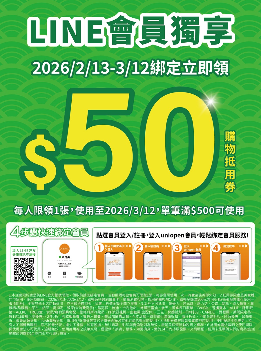 2/13-3/12 【LINE好友綁定會員送$50】