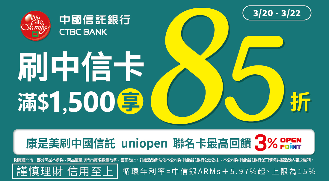1.活動期間於實體門市購買指定商品,刷中信卡單筆結帳金額滿$1,500享85折(扣除不適用商品、折扣金額、會員點數折現及信用卡紅利點數折抵),須整筆全額以中信卡支付。