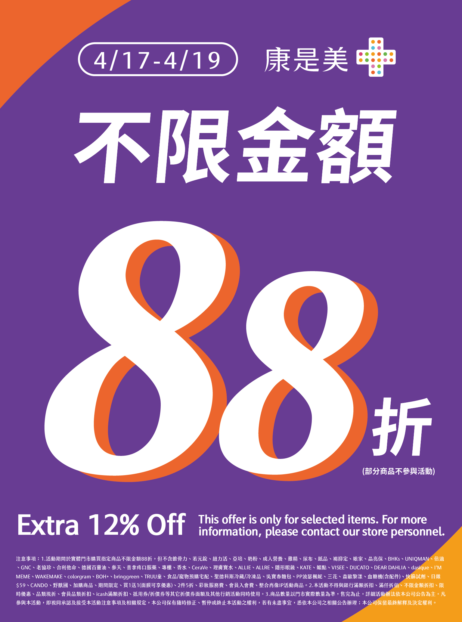 - 活動期間於康是美實體門市購買指定商品消費不限金額享88折。本活動排外商品:維骨力、若元錠、紐力活、亞培、奶粉、成人營養、雞精、尿布、紙品、褐抑定、娘家、晶亮保、BHKs、UNIQMAN、倍適、GNC、老協珍、合利他命、德國百靈油、參天、普拿疼口服藥、專櫃、香水、CeraVe、理膚寶水、ALLIE、ALLRE、隱形眼鏡、KATE、媚點、VISEE、DUCATO、DEAR DAHLIA、dasique、I’M MEME、WAKEMAKE、colorgram、BOH+、bringgreen、TRUU童、食品/寵物預購宅配、聖德科斯冷藏/冷凍品、吳寶春麵包、PP波瑟楓妮、三花、森歐黎漾、血糖機(含配件)、快篩試劑、日雜$59、CANDO、野獸國、加購商品、期間限定、買1送1(面膜可享優惠)、2件5折、彩妝服務費、會員入會費、整合肖像IP活動商品。本活動不得與銀行滿額折扣、滿仟折佰、不限金額折扣、限時優惠、品類現折、會員品類折扣、icash滿額折扣、抵用券/折價券等其它折價券面額及其他行銷活動同時使用。