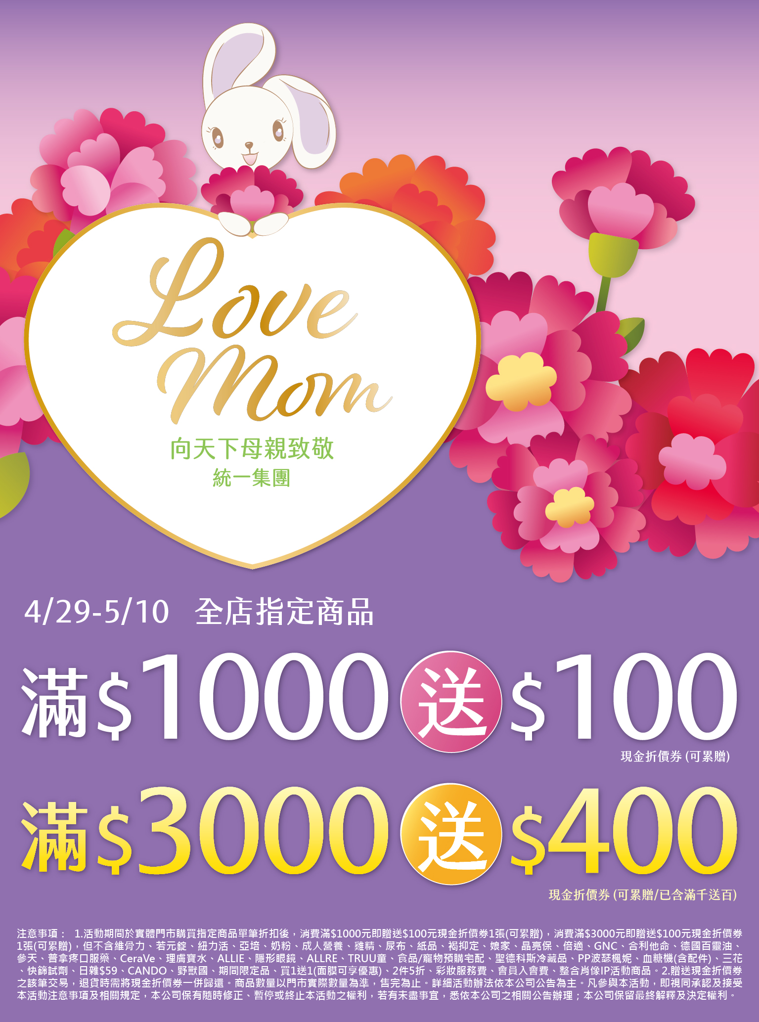 4/29-5/10 全店指定商品滿$1000送$100 滿$3000送$400